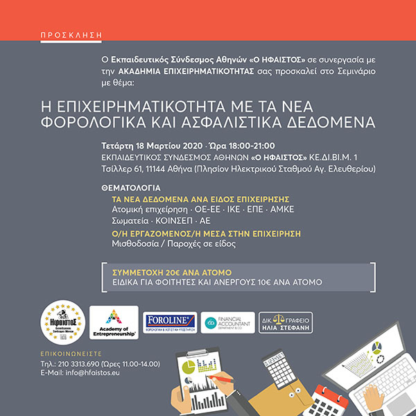 Το σεμινάριο το οργανώνει ο Εκπαιδευτικός Σύνδεσμος Αθηνών «Ο Ήφαιστος» σε συνεργασία με την Ακαδημία Επιχειρηματικότητας.