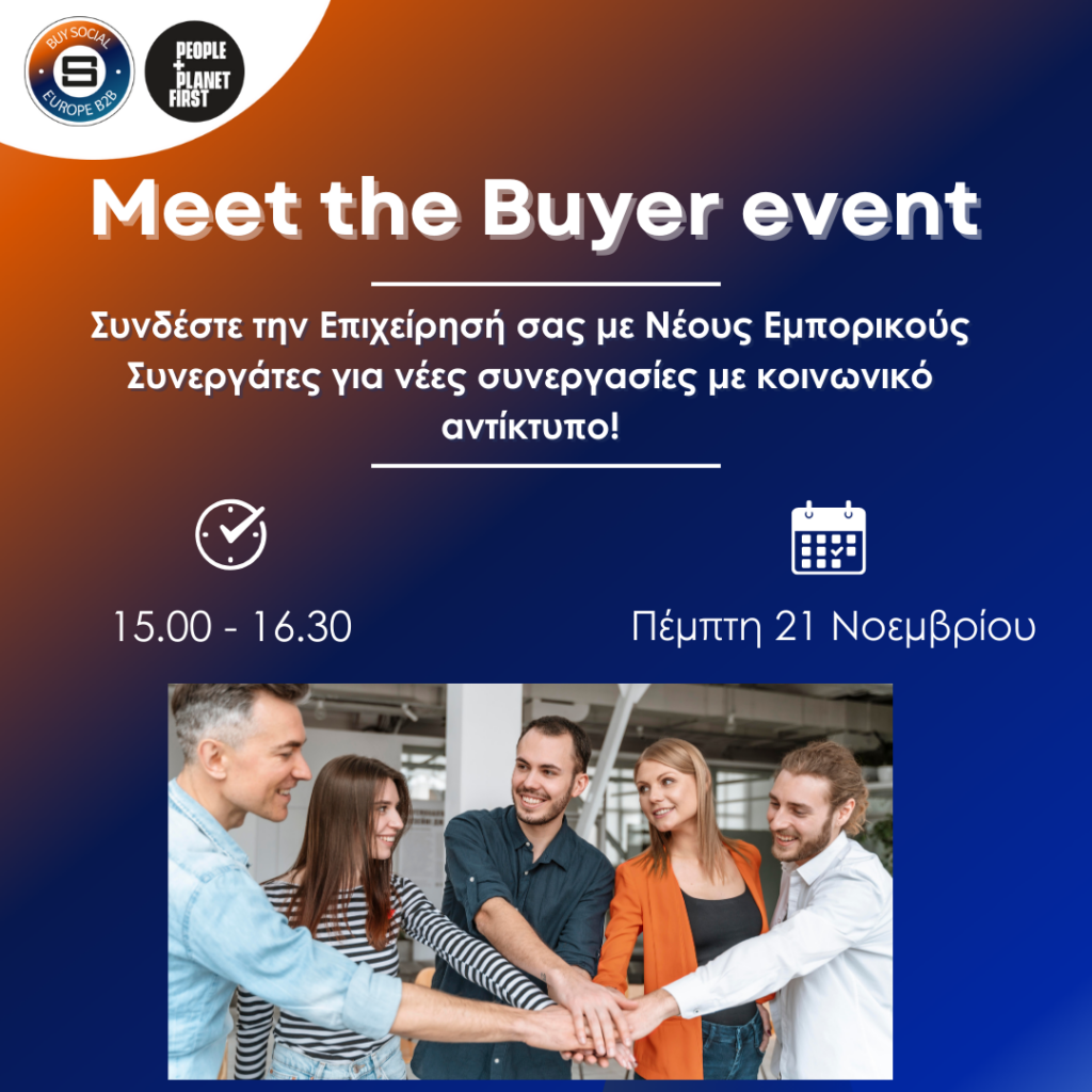 Στο πλαίσιο του ευρωπαϊκού έργου Buy Social Europe B2B, η Ακαδημία Επιχειρηματικότητας διοργανώνει ένα διαδικτυακό Meet the Buyer event την Πέμπτη 21 Νοεμβρίου. Αυτή η εκδήλωση φέρνει κοντά κοινωνικές και συμβατικές επιχειρήσεις, με στόχο τη δημιουργία νέων εμπορικών σχέσεων που προσφέρουν πραγματικό κοινωνικό αντίκτυπο και ενισχύουν τη βιωσιμότητα των εμπλεκόμενων εταιρειών.