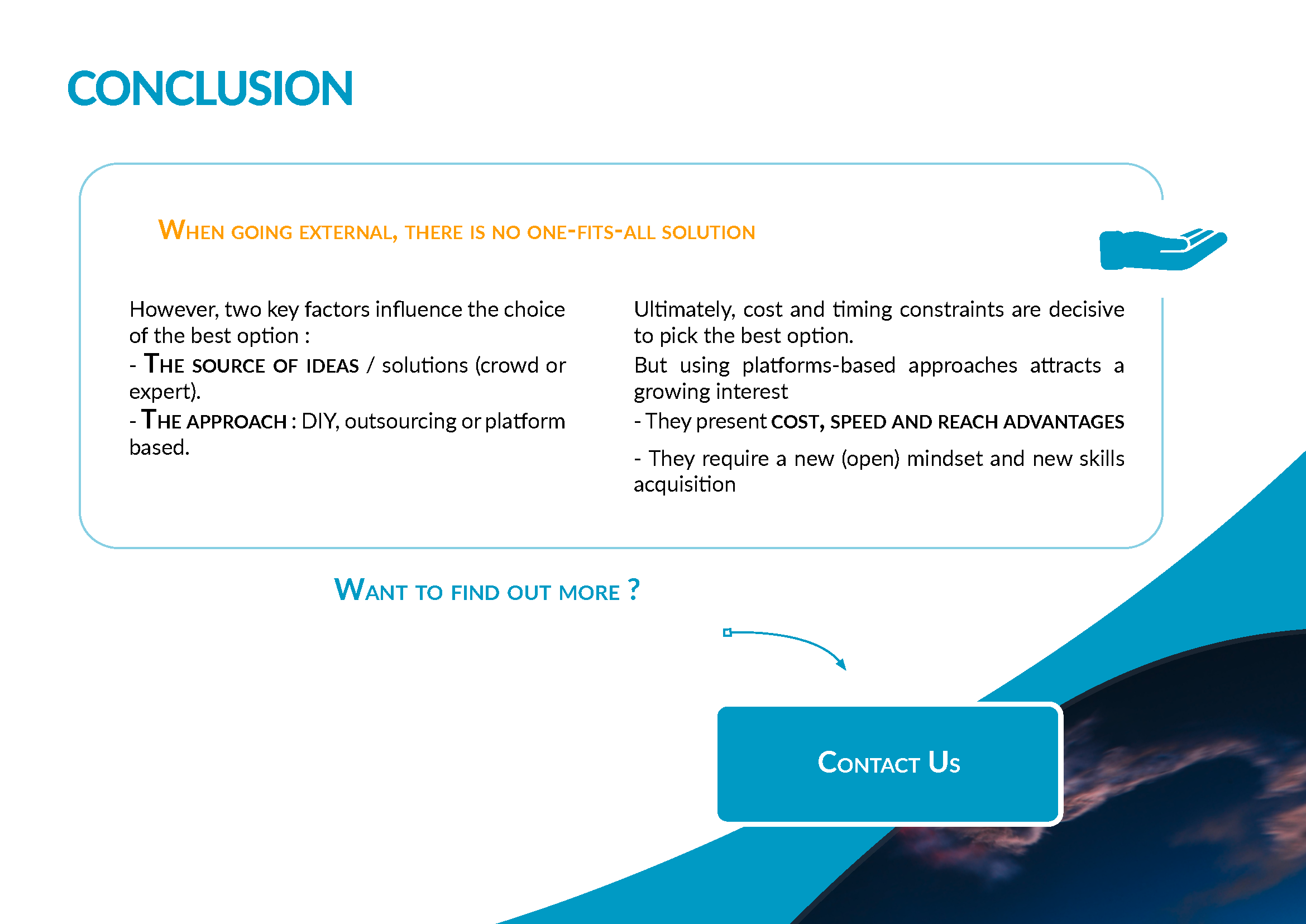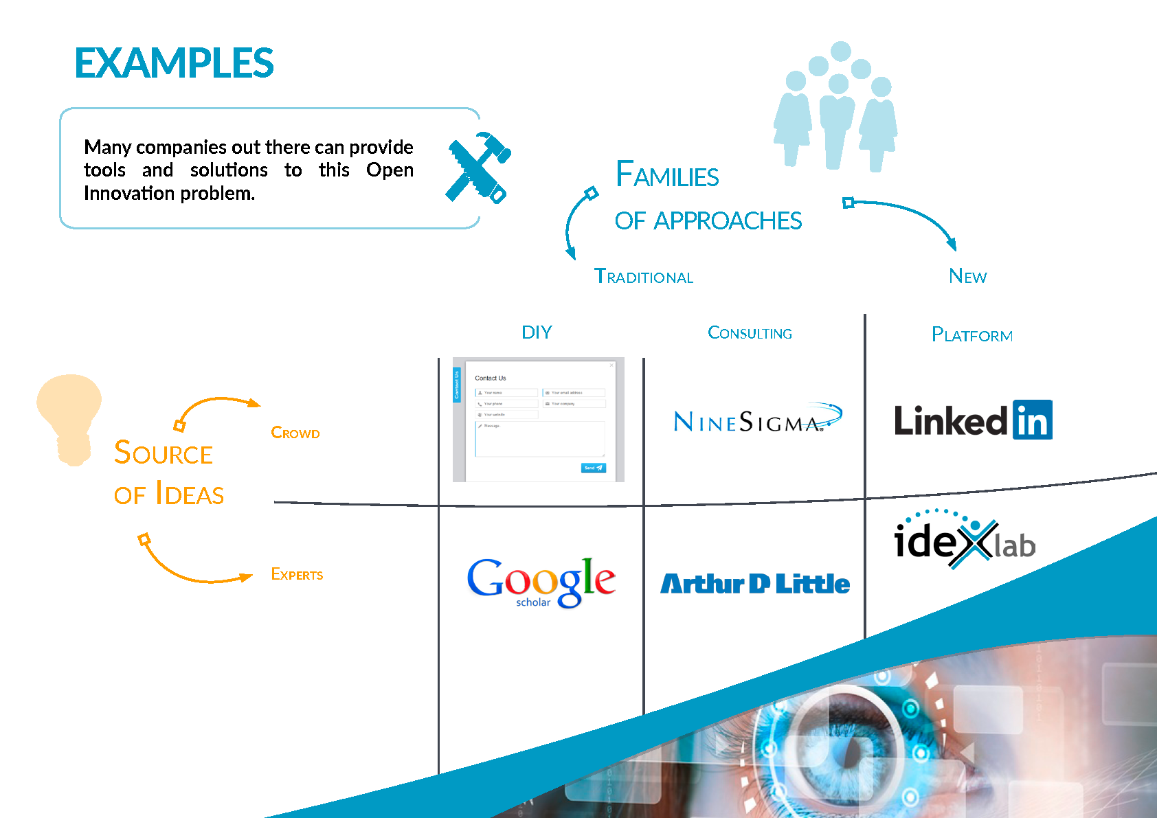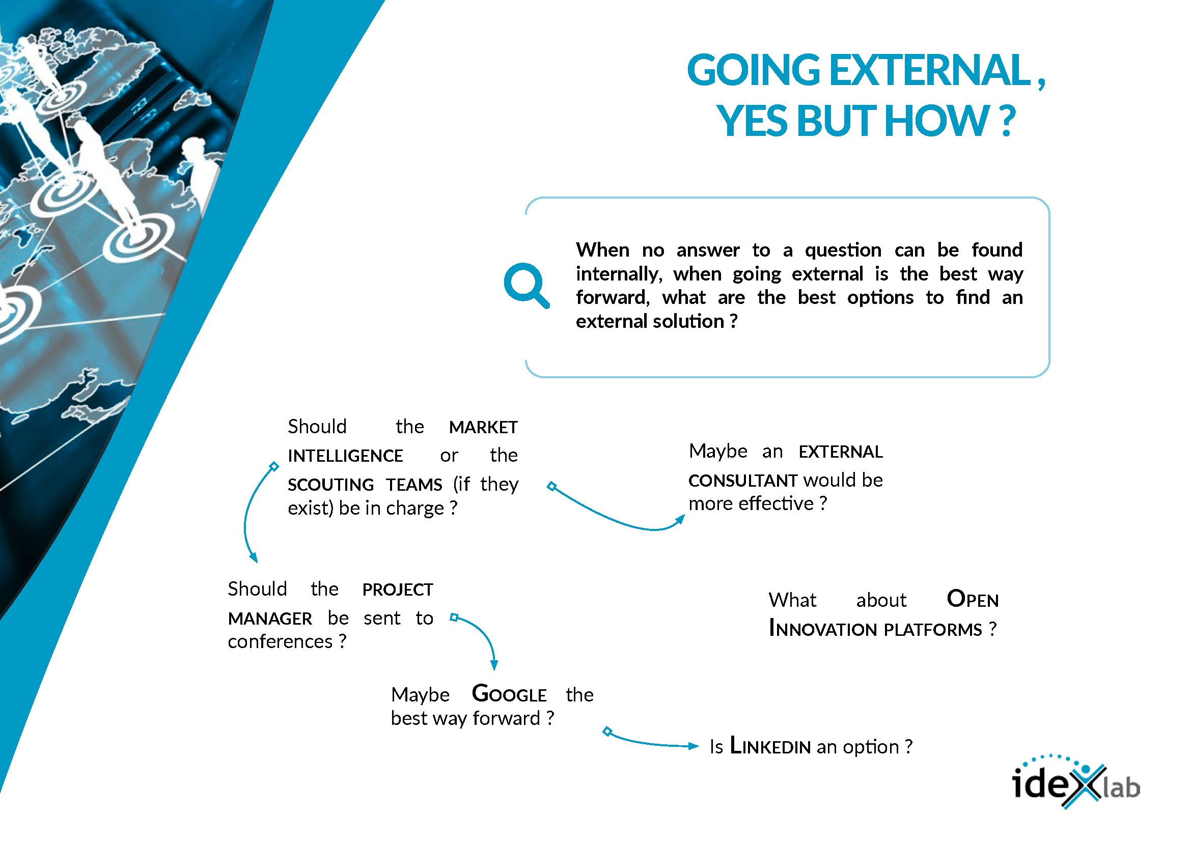 - The need to solve a technological or scientific issue for which the company does not have the competence and will seek external expertise (another form of “outside-in“).