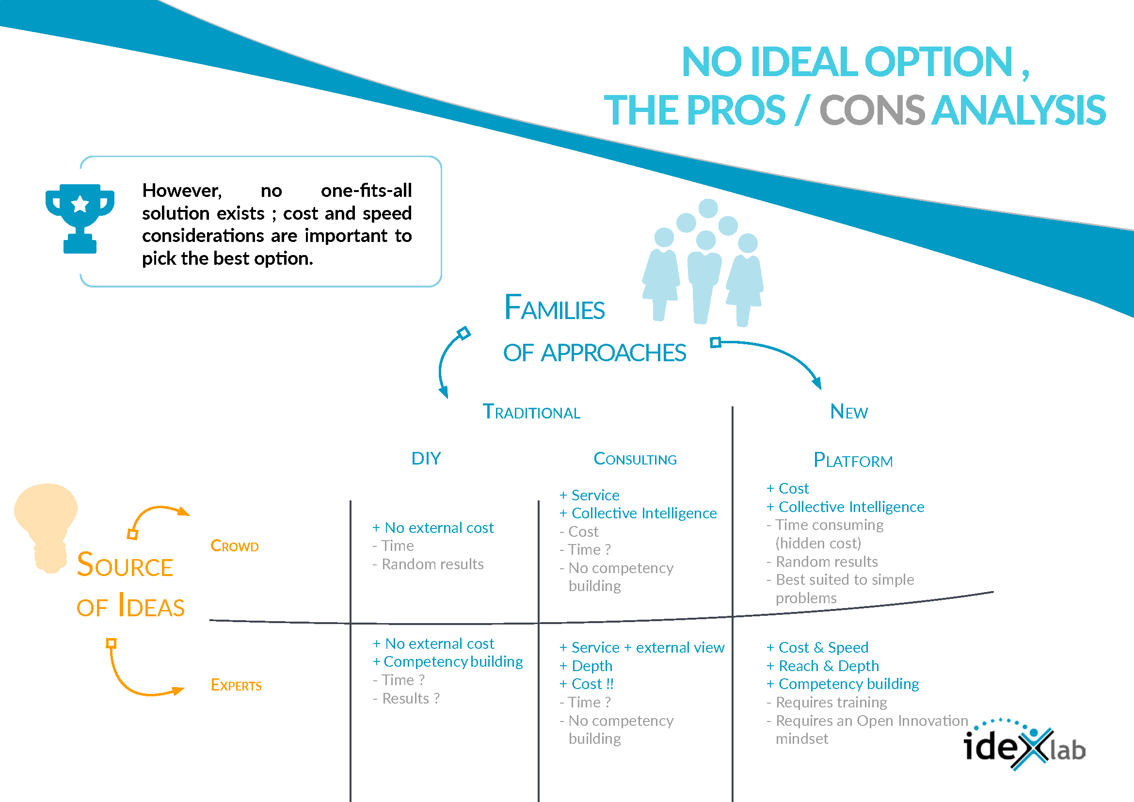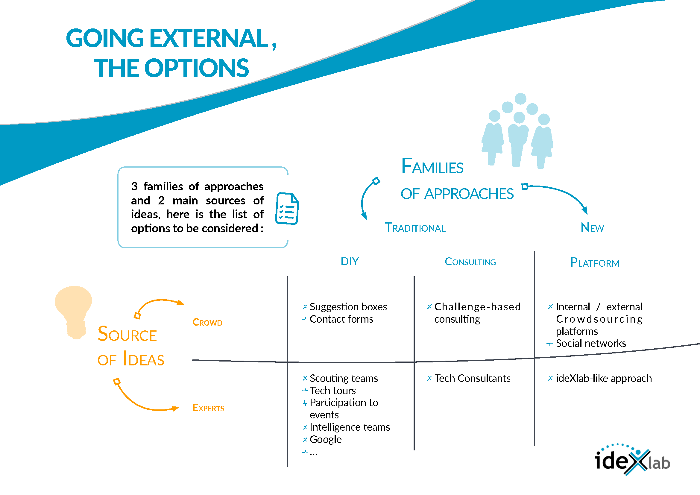 Open Innovation is the fact that a company opens its R&D department to external people or, internally, to employees from other departments. These outsiders are usually researchers and experts in a field or technology. More generally, a company can also rely on different actors with different resources such as customers, students, the crowd (also known as collective intelligence) or other companies.
